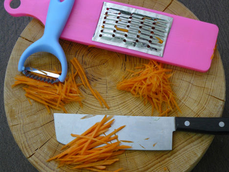 I recently purchase a couple of seemingly handy tools at my favorite Asian housewares shop. They were specifically made for shredding carrot and other rooty vegetables. I loved their plastic coloring and they were cheap -- 98 cents to $1.99. Here's how they fared against a knife: