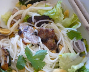 Bun Rice Noodle Salad Bowl is my all time favorite dish when dining in a Vietnamese restaurant. And to top it off, I take pleasure in shopping the Asian markets that are usually located next door. Seems simple enough to make, as I usually do have leftover meats stored in the refrigerator and quite frequently have cilantro, mint, Thai basil and chiles on hand. I'm glad to know the ingredients for the nuoc cham dipping sauce...and peanuts are a must!