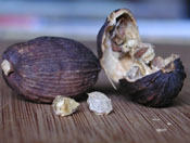 Some Viet cooks omit the cloves, reduce the amount of star anise and instead, use thao qua (black/false cardamom). Available at Asian markets, the dried brown pod (pictured above on the right) resembles a ridged whole nutmeg. Thao qua has a strong smoky, camphor aroma. In the recipe provided here, use 1 star anise and 1 thao qua; keep the cinnamon but omit the cloves. Use the flat side of a knife to gently whack the pod, breaking open its skin to expose the pyramid shaped seeds. Place in cheesecloth or a spice/herb ball and add it to the broth. Once you can smell its fragrance, remove the thao qua from the pot. Otherwise, it will over power the other elements. More on pho spices here.