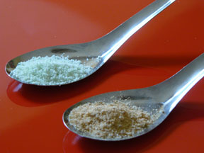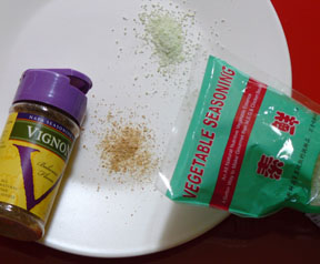 The powders I obtained were deemed to be all natural. The one from China, called Vegetable Seasoning, was the pale green and contained asparagus extract, carrot extract, western orchis (sic) extract, celery extract, salt, and amino acid (this last ingredient is a mystery). The other product, called Vignon, was developed by wine expert and taste educator Tim Hanni of Napa Seasoning Company. The tan powder is made from a bunch of ingredients, namely sea salt, natural flavors, yeast extract, maltodextrin, parmesan cheese, mushroom powder, garlic, and tomato powder.