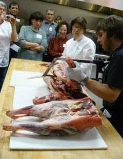 At "Got Your Goat," we learned about sustainable ranching from Jeannie McCormack and Al Medvick, the farmers who raise the goats on a ranch near Sacramento. Then Café Rouge Executive Chef and Owner Marsha McBride and the restaurant's butcher, Scott Brennan, gave us a great lesson on how to break down the bones on a goat and cook it. If you're not familiar with butchery terms, 'breaking down the bones' refers to the act of cutting an animal carcass into parts to be used in cooking.