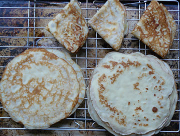 Slide the crepe onto a rack to cool. Repeat with the remaining batter to make more crepes, stacking them atop one another.