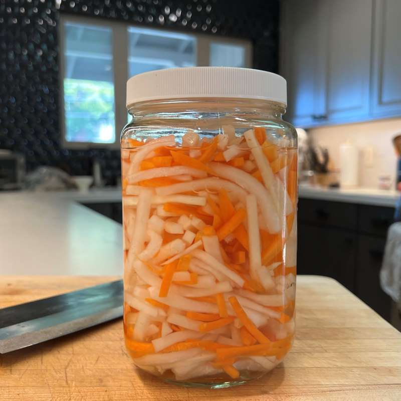 I've been looking for a recipe for these pickled vegetables. You won't believe how many times I've eaten banh mi and they don't give me enough of these pickled vegetables! Now I can make my own.