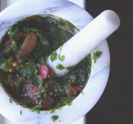 This is a relish - often described as a salsa by Hmong Americans - and you can serve it along with grilled pork, beef, chicken, shrimp, etc. I particularly like it with Vietnamese grilled lemongrass pork (thit heo nuong xa). If you like, dip a little sticky rice into this fiery masth, or stir it into food. You can just pound the chiles, salt, scallion and cilantro together if you don't have tomato around. It's quick and simple everyday Hmong condiment that's dynamite. Feel free to vary the amount of chiles according to your tolerance for heat.