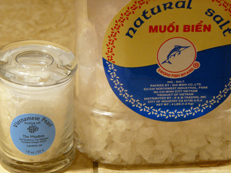 Playing around with all the salts has been fun -- there are varying flavors, textures, and colors -- but the one pictured above has thrown me for a loop. I just got it in the mail from salt expert Mark Bitterman, co-owner of The Meadow in Portland, Oregon. A self-described 'selmelier,' Mark is one of the country's leading salt sellers. He loves to delve into the chemistry, history, and culinary functions of salt. One of the salts that he's investigating is called Vietnamese Pearl. It's a super white salt from the motherland that's an artisanal product. Mark acquired it from a stateside distributor but doesn't have any information on it. He says that old Vietnamese women come into The Meadow -- a retail store specializing in salt, chocolate, wine, and flowers -- and go ga-ga over the salt. His Vietnamese is bit rusty (okay, nonexistent) so he hasn't been able to chat with them to obtain background information on the salt. Mark asked for my assistance so I'm checking all my resources - including you!