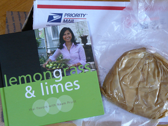 My mother didn't raise no fool and I immediately replied by providing my address. She was practically just as fast with sending the sugar as yesterday, I got a priority mail delivery that was unusually heavy. It was from Naam, who unbeknowst to me resides in Missouri (Asian people are everywhere!!!). Inside was a copy of her charming cookbook, Lemongrass and Limes, and a kilo (2.2 pounds) slab of sugar as soft as cookie dough. I could spoon it up, as you can see here: