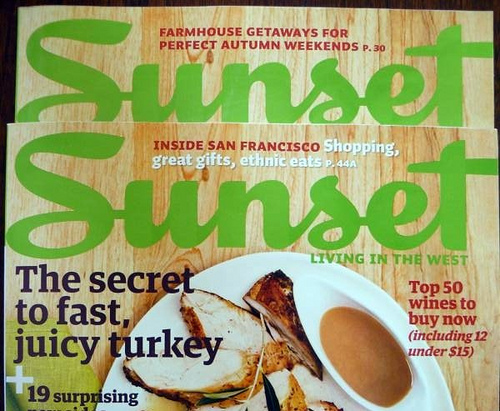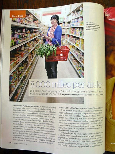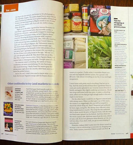 One of the food bloggers was Jennifer Reese of The Tipsy Baker, who wrote of the challenges and rewards of shopping for and making an entire meal from Into the Vietnamese Kitchen. Jennifer's piece appeared in the Northern California edition of Sunset magazine, which up until yesterday I thought I received. Lo and behold I've been getting the Southern California edition, which explains all the LA and San Diego stories! A Sunset editor kindly sent me the November 2009 issue in which Jennifer's piece was printed. Below are the covers that got me mixed up and the generous 3-page spread.