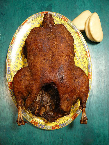 11. To serve, cut up the duck with the bones intact, or cut the flesh and skin off the bones. Serve with the warm buns and hoisin sauce. Invite guests to make duck sandwiches by stuffing some duck and skin into the buns and slathering on a bit of hoisin sauce.