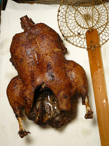 9. When the oil is sufficiently hot, dip the skimmer into the oil to prevent sticking, then put the duck on the skimmer, breast side up. Carefully lower the duck into the oil, which will gush up with bubbles to surround the duck. Immediately ladle oil on top to evenly cook. Keep ladling on the oil and fry for about 3 minutes, until the duck is a nutty brown. Carefully turn the duck over (have a friend steady the wok, if necessary), and fry for 1 to 2 more minutes. Remove the duck from the oil and drain on paper towel.