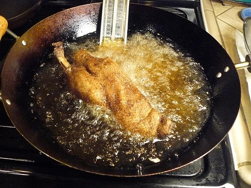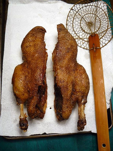 - When the oil is sufficiently hot, dip the skimmer into the oil to prevent sticking, then put one of the duck halves on the skimmer, skin side up. Carefully lower the duck into the oil, which will gush up with bubbles to surround the duck. Immediately ladle oil on top to evenly cook. Keep ladling on the oil and fry for about 2 minutes, then carefully turn the duck over (have a friend steady the wok, if necessary). Fry for 3 to 5 more minutes, until crispy and brown. Remove the duck from the oil and drain on paper towel. Repeat with the other duck half.