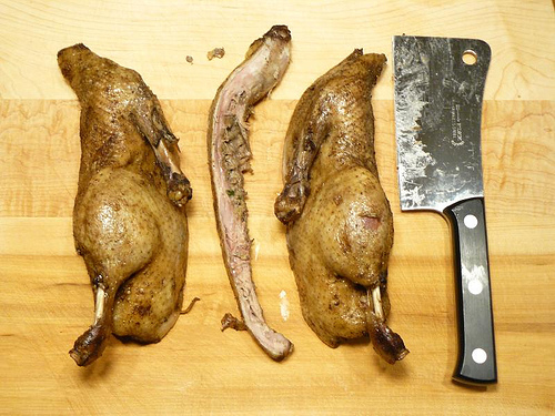 - Fifteen minutes before you're ready to fry the duck, cut it in half. Put the duck, breast side up, and use heavy knife or cleaver to bisect the duck. Remove the backbone, saving it for stock or discarding it.