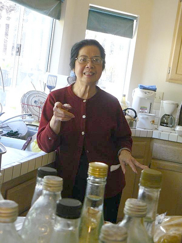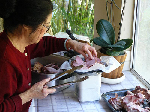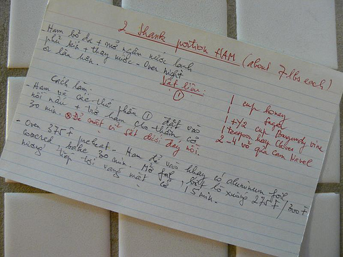 I’ve been in charge of Christmas Eve dinner for about 10 years now but in 2009, I was too busy to manage the entire meal. My mom took over and she brought back her ham. Ever the frugal Viet cook, she got an 88 cents a pound deal on ham at a local supermarket and came home with 2 butt portions. In the first photo below – she explains that the butt portion doesn’t have as much skin as the shank portion, making it less wasteful and a better cut to use. She used to use the shank portion, as mentioned in her handwritten recipe card. Finally, Mom's organizing the ham for freezing.