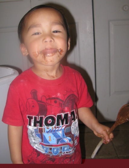 My little man and I did make the cake tonight. Here's what I learned about having a 3-year-old "help" make chocolate cake:
