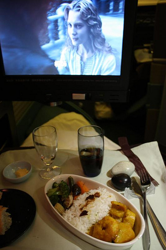 At the Cathay Pacific business class lounge, there were steamed siu mai, bao, and xiao long bao. Additionally, they had a noodle soup bar with fabulous Sichuan dan dan mian that wasn’t overly spicy (great for a flight!). I also eat fruit and drink water. You can get mixed drinks at an airline lounge or in an airport bar but for a long-haul, I skip it because I tend to overdo things. During the flight I tend toward the more simple meal offerings, which on a Cathay flight, means that there is either rice or noodle involved. I’m not good with dairy so I skip rich cakes and eat fruit and some aged cheese, when available.