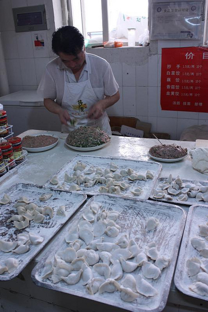 I had my Flip video camera and capture the footage in the video below. Note that you can buy freshly made dumplings at these Chengdu markets. Additionally, there is usually a noodle maker at the market who rolls out dough for noodles as well as dumpling skins. The skins that these two dumpling makers used were precut and very soft. Convenient, huh?!