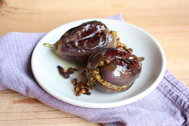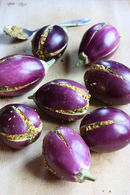 Before eggplant season ends, make this wondrous recipe with small Indian eggplants. It is one of my favorite eggplant preparations. The eggplants are cleverly stuffed (see photo below) with a delicious mixture of peanuts, sesame seeds, cilantro, garlic and spices. Then they are pan-fried with a little water to cook through. It's much like cooking potstickers! Seriously.