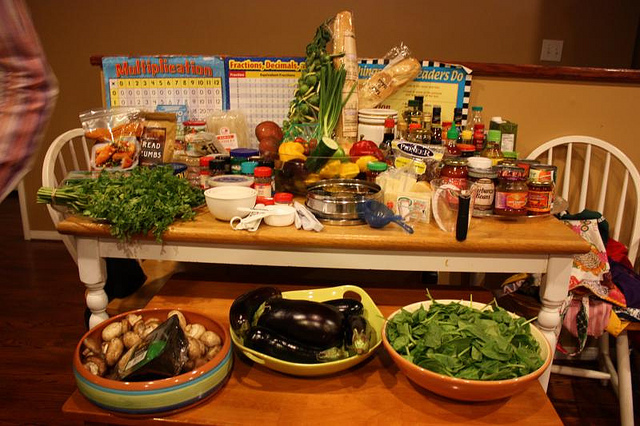 People broke up into teams and quickly got to work, hovering around the ingredients table and then prepping at their stations. There were a limited number of cutting boards, knives, mixing bowls, and basic equipment for all to share. After all, it was a home kitchen set-up so the teams had to improvise.