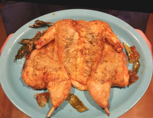 - Easy to cut: Tableside carving of a whole bird is a special skill. A butterflied roasted bird sits flat and is easier to cut up in front of a crowd. On the other hand, you can be Asian and cut the bird in the kitchen and present it in large bite-size pieces. Guests using chopsticks may appreciate that!