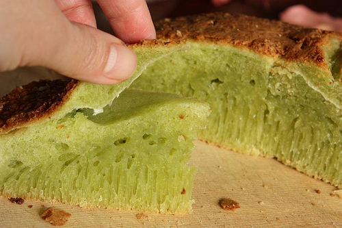 The resulting cake looked like the Elephant Man with that bump you see. Was my oven heat THAT uneven? I let the cake cool and when I went to unmold it, it WOULD NOT come out. I thought I'd lost it. Then I cut and pried out a wedge of the cake. It was gloriously green, not lead-like in weight, and had the vertical honeycomb trenches. I was all smiles! But, the parchment paper was nowhere.