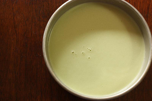 Then extract the green liquid through a piece of muslin, squeezing as much out as you can. (See this post on pandan for guidance.) Whisk in the reserved coconut cream. Then combine with the eggs, whisking until well incorporated.