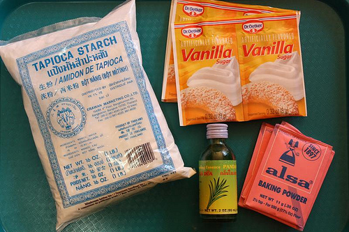 There are just a handful of ingredients in this cake -- tapioca starch, sugar, coconut milk or cream, pandan extract, eggs, and leavening. To help Thu, I looked online for a recipe and found several banh bo nuong recipes that specified using single-acting baking powder sold at Vietnamese markets. That's the pinkish Alsa envelopes below. My mom dug up a recipe from her friend's daughter that called for Alsa and vanilla sugar, also sold at Vietnamese markets. Some recipes specify a particular brand of tapioca starch too. Below is what I typically use, the 3-headed elephant. Additionally, there was the holiday green pandan extract and a warning to avoid using coconut milk and instead use the thick cream.