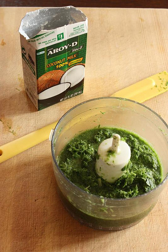2. Separate the thin from the thick coconut milk. Set aside the thick milk. Use a mini food processor to grind the thinner milk with the pandan.