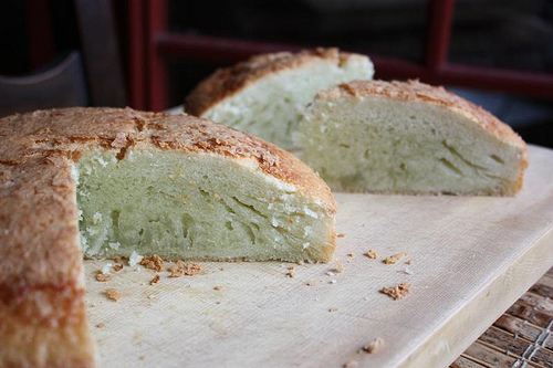 This is one of the strangest things I've ever baked. I went three rounds with it as part of a small project with Thu N., who emailed me a while back asking for help in making one of her favorite Vietnamese sweets. If you're not familiar with banh bo nuong, it's a chewy, coconutty green cake often sold as slices on Styrofoam trays at Vietnamese bakeries. The color and tropical, grassy notes come from pandan leaves (la dua).