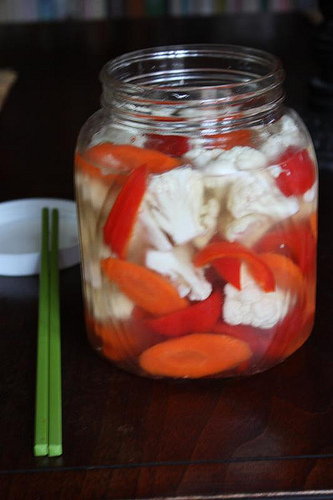 Over the weekend, I made a batch of Vietnamese pickles. They're a family favorite called dua gop and combine cauliflower, carrot and red bell pepper. It's a recipe from Into the Vietnamese Kitchen that's easy to put together, and within 24 hours, the tangy crunchy vegetables are ready to eat. For Tet, Vietnamese people love to have pickles to cut the flavors of hearty foods such as the sticky rice cake.