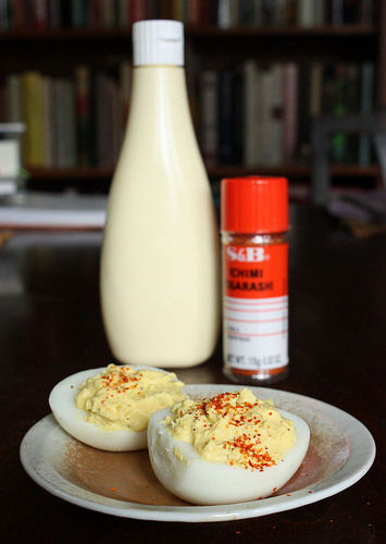 It was a cinch as I had those boiled eggs in the fridge from the first outage. To make sure that there was plenty of crazy MSG flavor, I used Japanese Kewpie mayonnaise. Sweet pickle relish gave the yolks a nice tangy flavor. A sprinkling of ground chile pepper (ichimi togarashi) added color and zip.