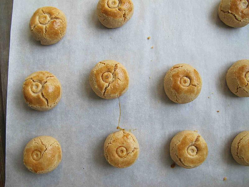 These peanut cookies have little cracks on the outside. Karen was concerned about the cracks because they didn't jive with her childhood memory. I tried cutting down the baking powder to ½ teaspoon but the cookies still cracked. I think they're quite lovely and leaving them as is. They add character and evoke the delicate richness of the cookie. Thanks, Shinto, for the cookies!