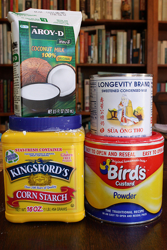 1. In a saucepan, whisk together the salt, custard powder, sugar, and cornstarch. Whisk in the coconut milk and condensed milk. Heat over medium heat, stirring constantly, until smooth. Add the butter and continue stirring until the butter has melted.