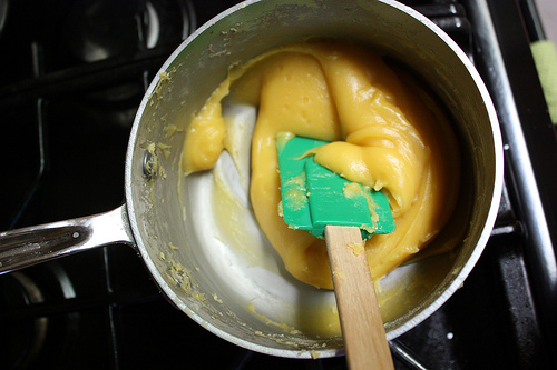 Keep stirring for about 6 minutes, until the mixture has thickened substantially. If it seems hard to stir with the whisk, switch to a spatula. As the mixture stiffens it may look like there are lumps. If you see that, stir more vigorously to break the lumps up and evenly cook. Aim for a smooth texture.
