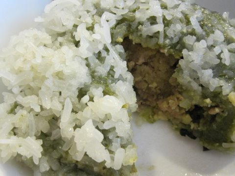 Oh boy, banh khuc (first 2 photos above) are a terrific northern Vietnamese dumpling made of a sticky rice dough that's tinted green with fresh leafy greens (in the US, that's spinach!) and filled with a rich mung bean, fried shallot, and pork filling. The white little bits on the outside are grains of sticky rice.