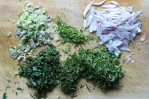This may also be called nasi kerabu. James says it's an old Malay dish but I found it to be a wonderful new way to enjoy rice and the warm weather's bounty of fresh herbs. The original recipe called for toasting freshly grated coconut, which I lacked. The dried coconut was okay but in a pinch, you can skip it. With regard to the dried shrimp, keep it for savory, umami depth.
