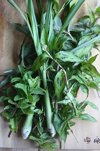 Leaves from 1 small bunch lemon basil, Thai basil, purple perilla (tia to), Vietnamese balm (kinh gioi), or Italian basil