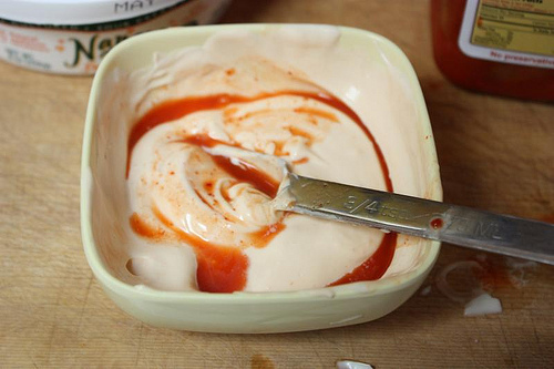 2. To make the kimchi sour cream, stir together the kimchi juice, salt, sugar, garlic, fish sauce, vinegar, sour cream, and mayonnaise. Let sit for 5 minutes then taste and adjust the flavor. Cover until you are ready to serve. Makes about ¼ cup.