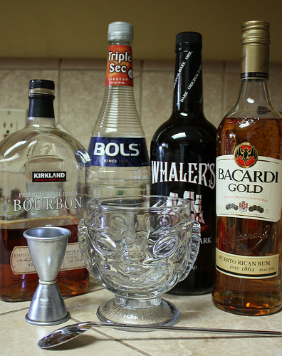 However, Rory had read that a little fragrant bourbon is sometimes added to the Mai Tai. We had a bottle of decent bourbon and gave it a go. This is the liquor that went into the goblet: