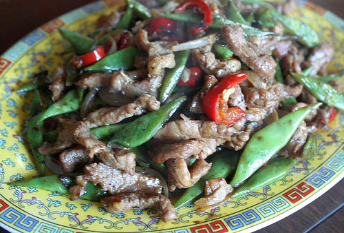 I had no sweet Italian peppers, as called for in the recipe, so I substituted tender Romano beans from the farmers' market. A Fresno chile lent color and a tiny bit of heat. Balancing texture, color, and flavor is key to stir-frying just like it is with any cooking.