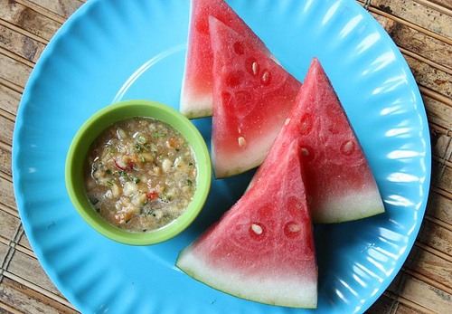 I always want to try out new foods. The watermelon looks delicious but the sauce looks scary to me.
