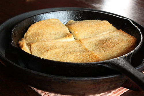 - 8-inch skillet: Is a nice size for this recipe because 4 slices of trimmed bread is about all you need. They fit neatly without overlap to cover the apples. Plus, the 8-inch skillet is perfect for 4 servings. I normally use a 10-inch All-Clad skillet because it has good insulation to cook evenly. This time around, I pulled out a Lodge cast iron skillet (see above).