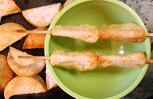 I ended up free-styling the shells in a small skillet in about ¼ inch of oil. If you've ever cooked an Indian papadum, you know that thin doughy sheets become pliable when subject to heat. You can bend them and after a while, they'll hold their shape. To guarantee that shape, I hung the crisp shell over a ladle handle (a chopstick works too) suspended over a bowl to cool.