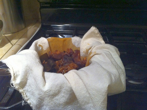 5. Strain - Use it for hassle-free straining of liquids, such as stocks and broths. Last night, I used muslin to strain a double batch of one of my favorite stealth ingredients, Japanese seasoned soy concentrate (Asian Tofu, page 208). It contains a number of ingredients including soy sauce, dried kelp, dried shiitake, and shaved bonito flakes, which can get messy for clean up; see the photo below. When I'm through with straining and pressing the soy concentrate, I dump the solids into the trash. I regularly use muslin to to produce a super clear dashi broth too.