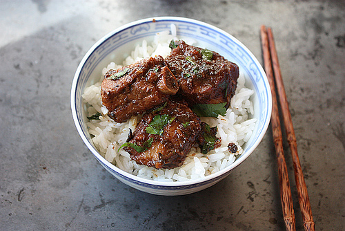 Pork riblets braised in garlic and black bean sauce - Showcases how black beans can be used in a supporting role. Read: you wouldn't know they were there but they're responsible for the deep savory flavor of the ribs. These riblets are like the riblets in caramel sauce recipe that's in Into the Vietnamese Kitchen (suon kho, see page 148) in that they're deeply savory. On the first time out, my husband mistook the pork riblets for beefy morsels.