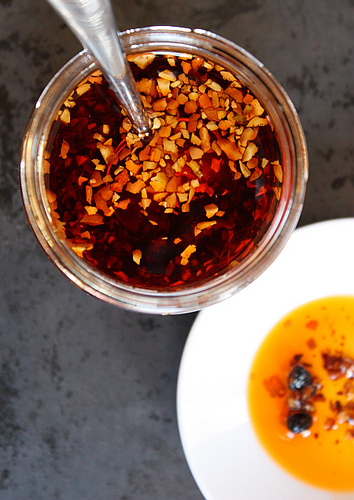 Chile Oil - Finally, what about a condiment with black beans? You can keep it within reach. I typically like just the dried red chile flakes and peanut oil (the recipes in Asian Dumplings and Asian Tofu) because that simple combination is more pure and versatile. However, some chile oils contain other aromatics to add layers of flavor.