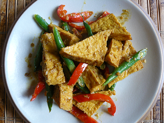 With bigger pieces of tofu, deep-fry them. The dish above is Vietnamese in origin. It's the lemongrass tofu with chiles from page 108. I first had it on Phu Quoc island (a place famous for fish sauce) and fell in love with it, not just because I was sitting on the beach with a cold beer in my hand. Dau phu xao xa ot is an amazing Viet tofu dish.