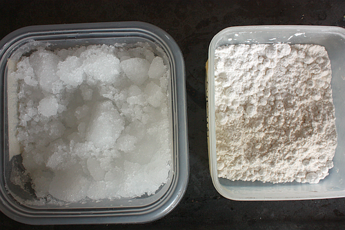 If you can have only one tofu coagulant, which should it be? As suggested in Asian Tofu, gypsum is the most versatile soy milk coagulant. It produces tofu that’s a little on the sweet side whereas nigari tends to be a touch bitter. The curds are a bit loftier with gypsum so you can coax soy milk into tender tofu. Nigari coagulates quicker but the curds can be smaller than those made with gypsum so your tofu is firmer. Pictured below are refined nigari (left) and gypsum (right).