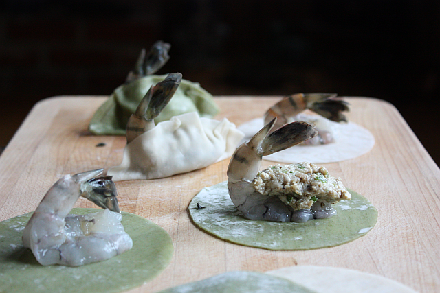 - To make each dumpling, center a shrimp on a wrapper, cut side down with the tail pointing up. Top with about 1 teaspoon of filling.