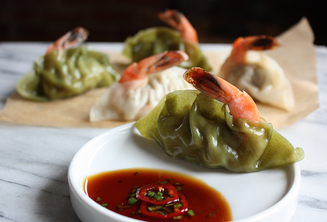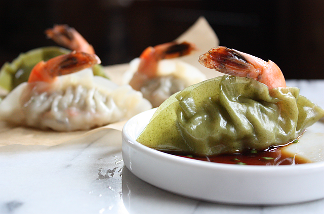dumpling, seam side up, on the lined steamer tray. Repeat to make more, putting any overflow dumpling on a parchment-paper lined baking sheet sprinkled with flour. Cover the finished dumplings loosely with a dry dishtowel to prevent drying. - Steam the dumplings over boiling water for about 8 minutes, until the shrimp tail is pinkish orange and the skins are translucent and a little puffy. Serve immediately with the dipping sauce, inviting guests to use their fingers or chopsticks to eat.