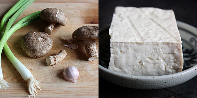 As with most Korean dumplings, tofu is involved, so are garlic and green onion. A little pork goes a long way to enriching the filling; use chicken thigh if you're not porky. The shiitake mushroom contributes extra umami.