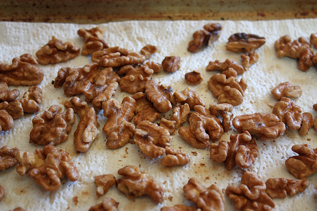 Line a baking sheet with 2 or 3 sheets of paper towel. Arrange the walnuts on